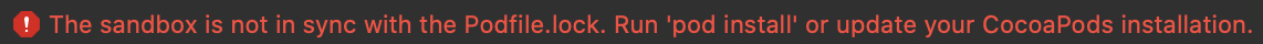 에러 내용은 'The sandbox is not in sync with the Podfile.lock. Run 'pod install' or update your CocoaPods installation.' 이었다.