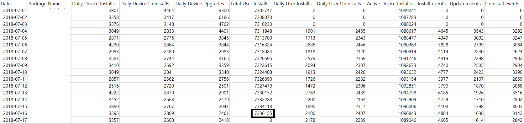 만약 2018년 7월 16일 이후에 앱을 론칭한 분들이라면 모든 월의 엑셀을 다운로드한 후 모든 'Daily User Installs'를 더해주면된다.
