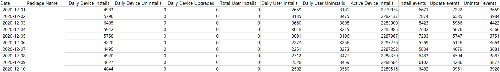 문제는 위의 엑셀에 보면 'Total User Installs'라는 항목이 모두 0으로 노출되고 있다는 것이다.