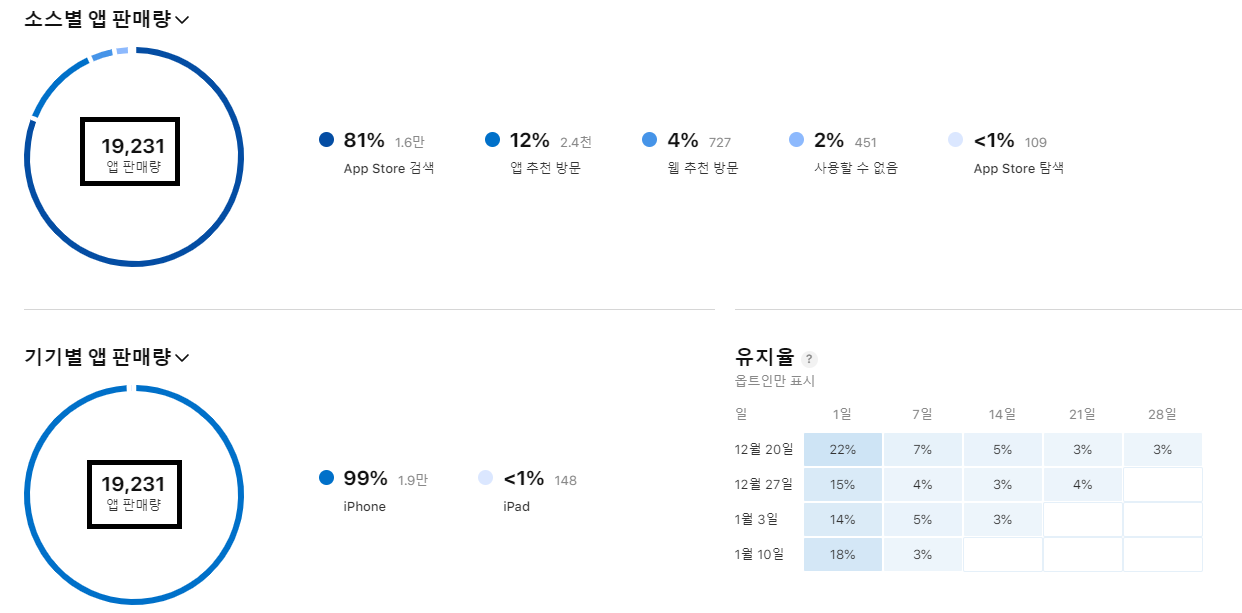 5. 페이지 하단으로 스크롤을 하면 '소스별 앱 판매량', '기기별 앱 판매량'에서 전체 앱 판매량 수치를 알 수 있다.