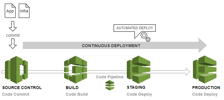 AWS CodePipeline은 사내에서 실행되는 Amazon EC2 인스턴스 및 인스턴스에 대한 코드 배포를 자동화하는 서비스인 AWS CodeDeploy, Chef를 사용하여 애플리케이션 운영을 돕는 구성 관리 서비스인 AWS OpsWorks, 웹 애플리케이션 배포 및 확장 서비스인 AWS Elastic Bestalk와 직접 통합된다.