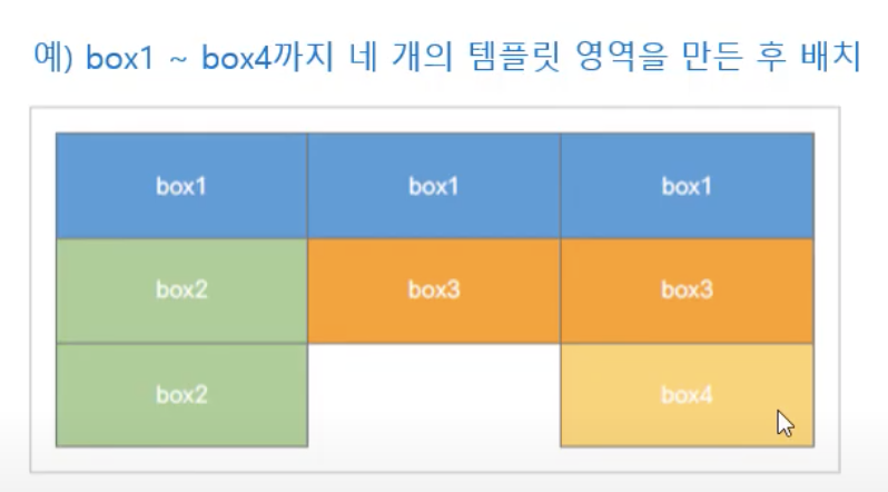 - grid-area 속성을 사용해 템플릿 영역을 만든 후, grid-template-areas 속성을 통해 배치