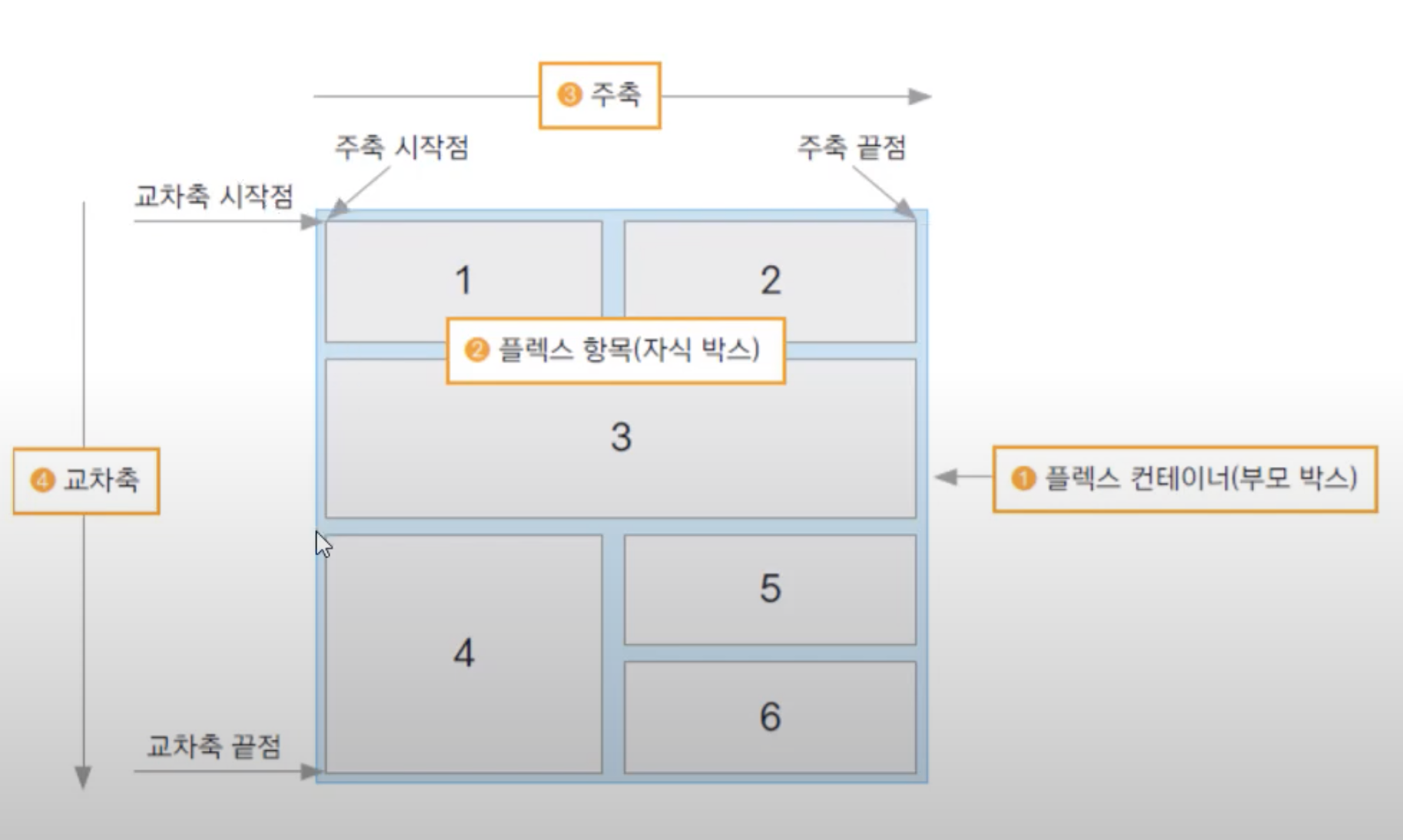 - 플렉스 박스 레아웃을 만들려면, 플렉스 컨테이너로 감싸주고 플렉스 항목을 배치하는 데 주축의 시작점에서 주축의 끝점으로 배치를 하고 주축의 끝점에 도달하면 교차축의 시작점에서 교차축의 끝점으로 배치하는 방식
