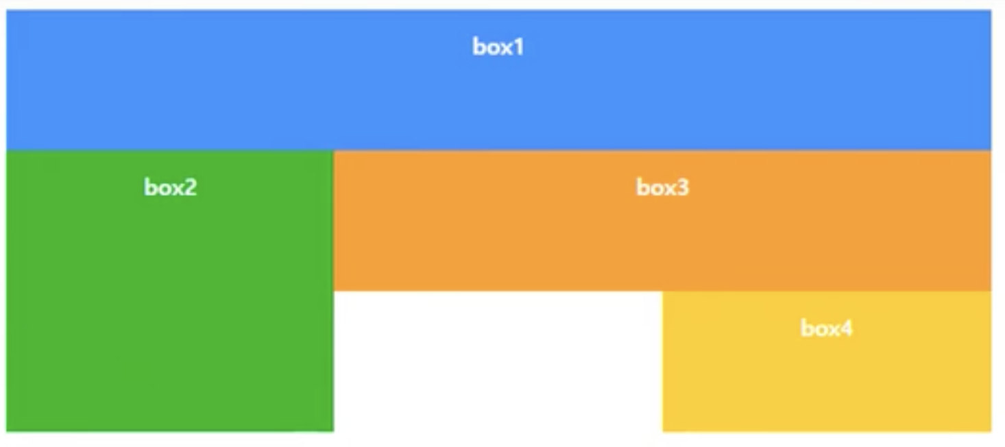 .box1 { grid-columns: 1/4; } .box2 { grid-row: 2/4; } .box3 { grid-columns: 2/4; grid-row-start:2; } .box4 { grid-column-start:3; grid-row-start:3; }