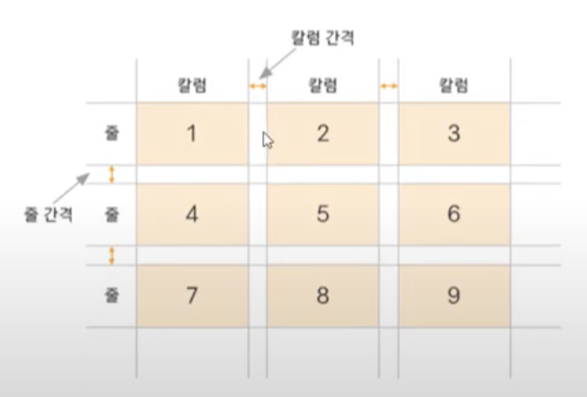 - 줄(row)과 칼럼(column)으로 화면을 구성하고, 줄 사이의 여백(gap), 칼럼 사이의 여백을 조절.