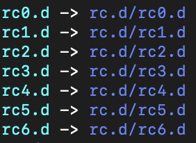 이 디렉터리들에 들어가보면 실제 파일 대신 init.d 디렉터리에 저장된 스크립트를 참조하는 심볼릭 링크가 보인다. 서비스 기동 스크립트는 사실 init.d에 있고 도구를 사용해서 런레벨에 해당하는 디렉터리에 링크를 생성한다.